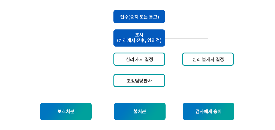 ■ 경찰 수사 → (송치) 가정법원 또는 지방법원의 소년부 → 보호처분 → 전과기록 남지 않음